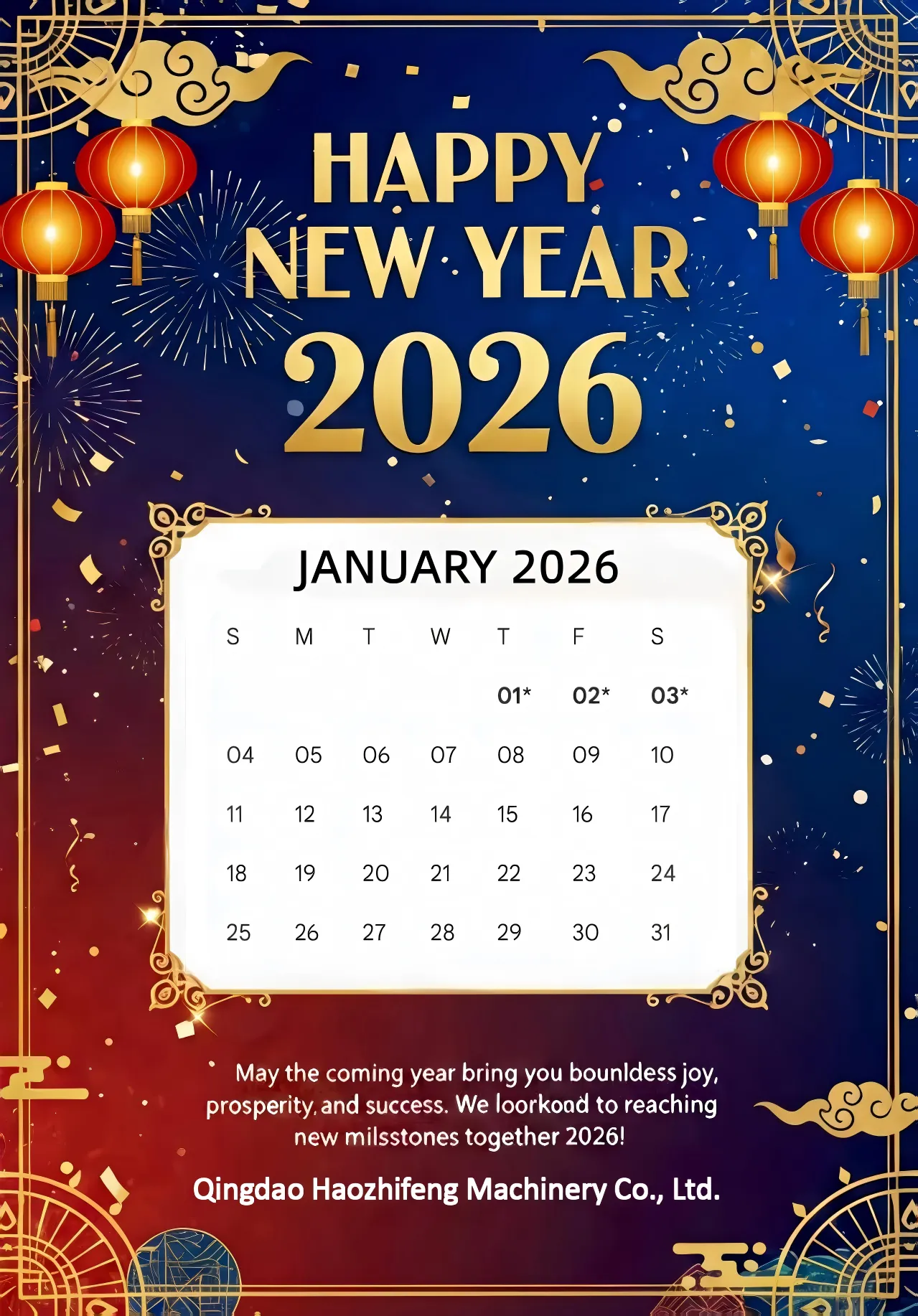Semoga Tahun Baru 2026 membawa anda kegembiraan, kejayaan dan semua nasib baik! Kami berharap untuk terus bekerjasama dengan anda pada tahun baharu dan mencipta lebih banyak pencapaian cemerlang bersama-sama.